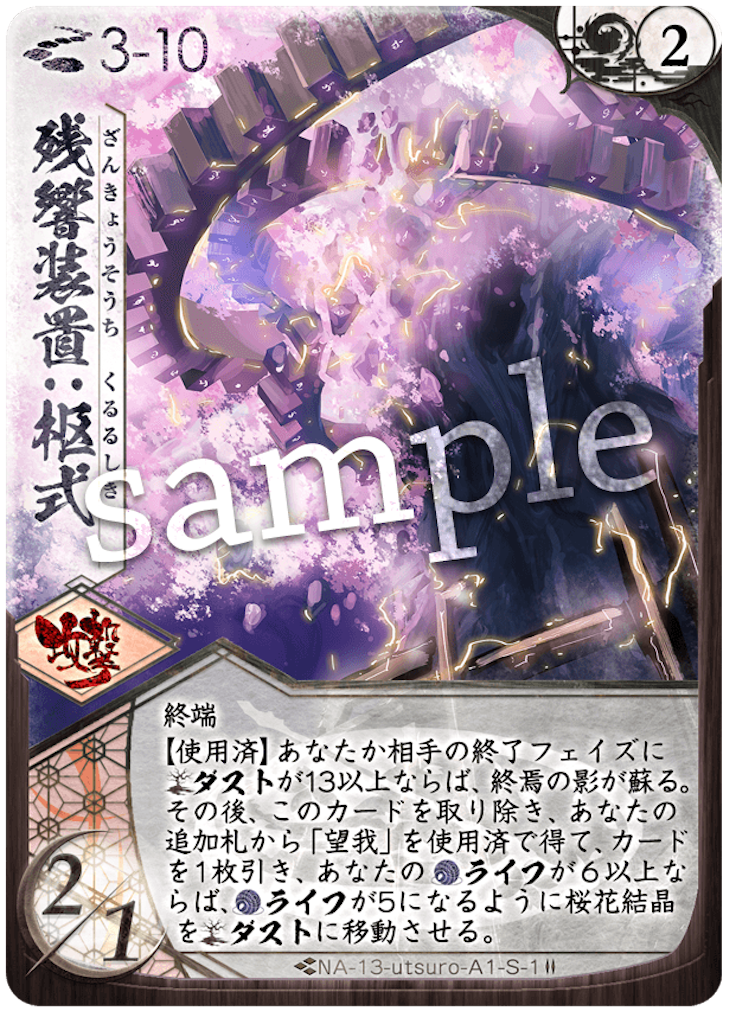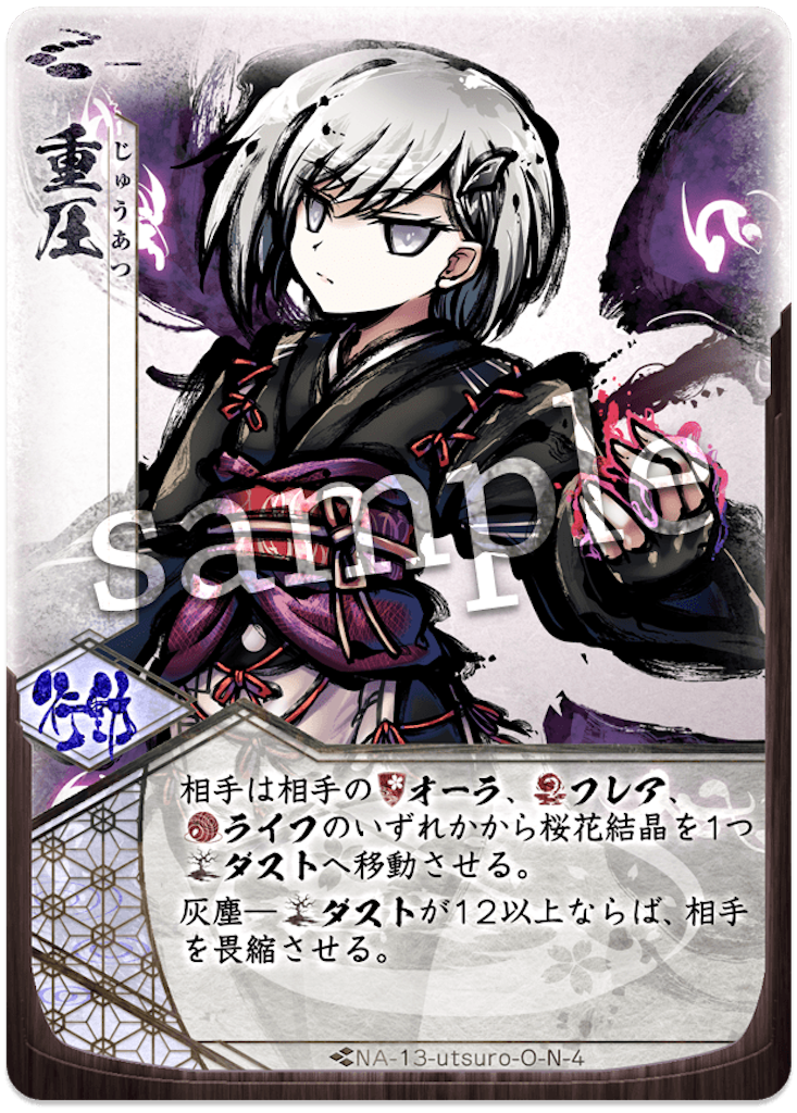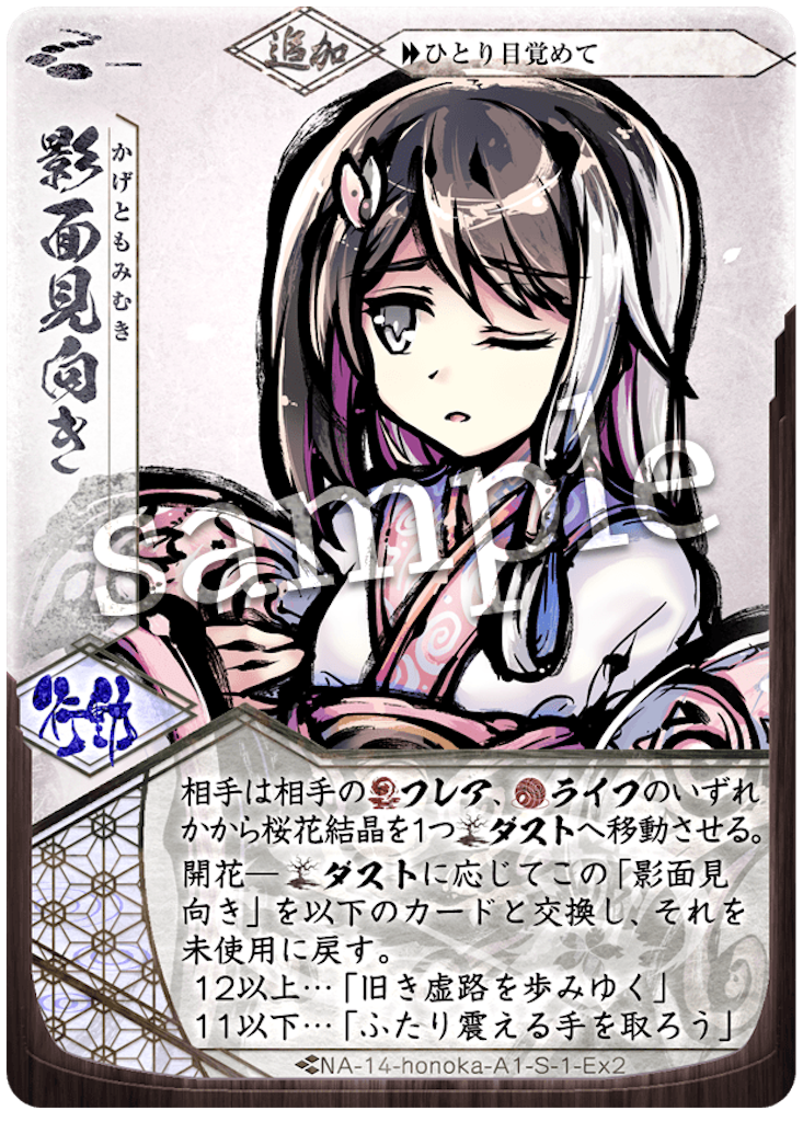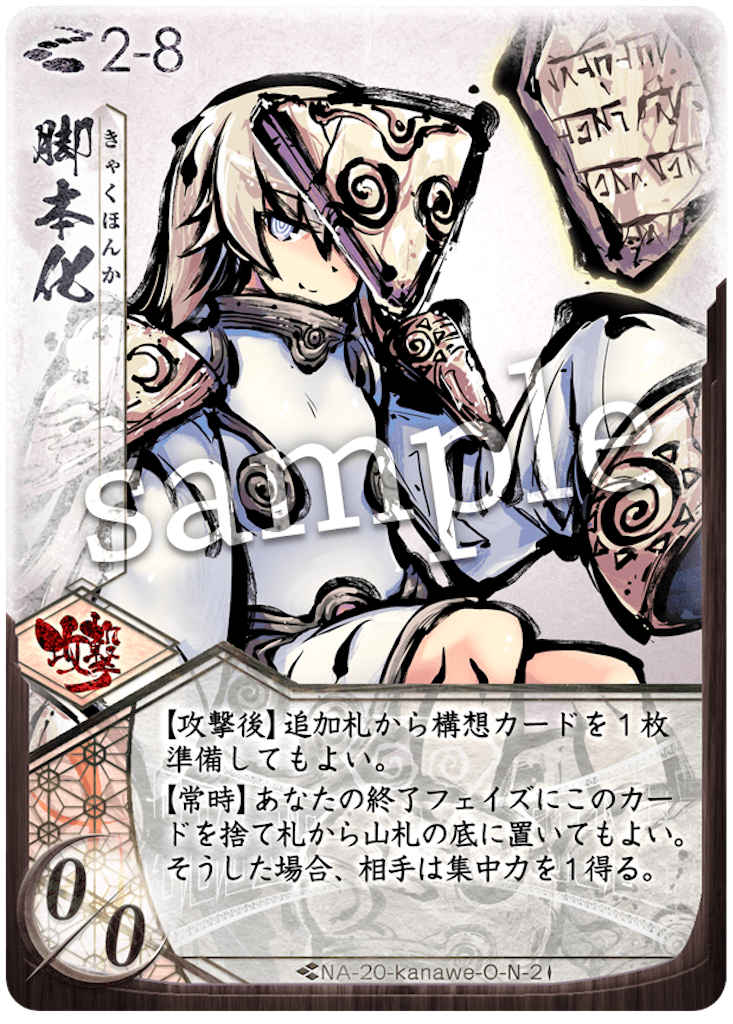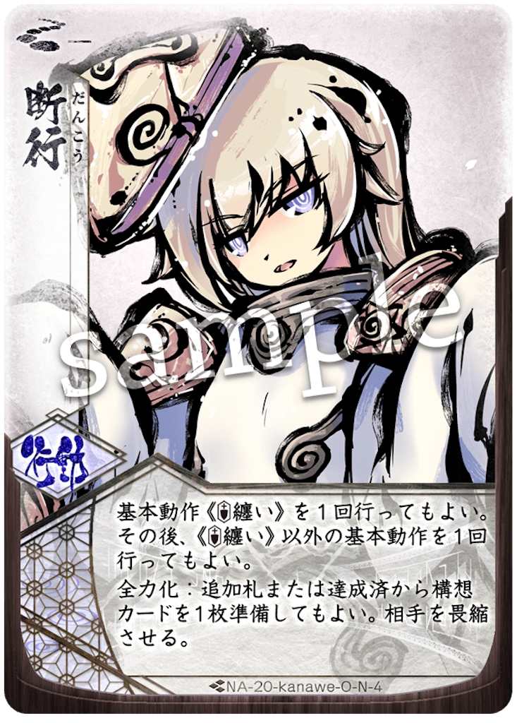 1巡目はゆっくりした展開。2巡目、斬一閃には、防壁が使えず、体で受けます。返しも何もできないので、しゃがみの大手楯無門で防壁を埋めます。5T目に守護霊式が出て来たので、すぐに防壁で止めます。返しの反攻はライフ。ここで、「守護霊式の開花を止める」&「天主ラインにライフを落とす」のどちらも達成できたので、いい感じです。6T目、阿吽から、斬はライフ。次ターン再構成でもう一度斬は撃ち落としで消しますが、この旗を使われて、盾兵で対応したものの阿吽の納が+2され阿吽の2/1はライフ。かなりのテンポでライフ差が5-7です。返しは再構成から制圧前進でしゃがみます。